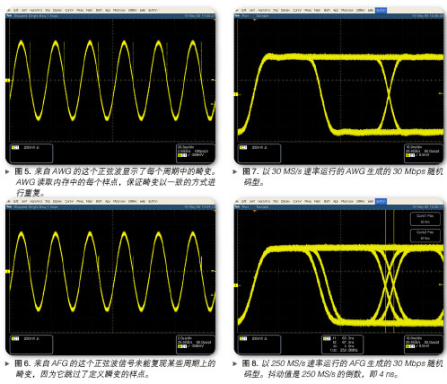 之所以出現(xiàn)抖動,是因?yàn)锳FG擁有固定的取樣速率,其不是數(shù)據(jù)速率的倍數(shù)。AWG則沒有這種限制(盡管任何實(shí)際環(huán)境信號源都會產(chǎn)生某些抖動)。