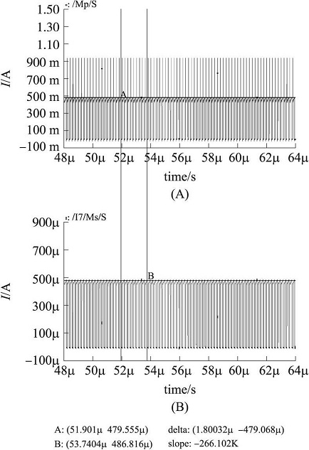 從輸出波形的測量可知, 當電感電流IL 最大值如A 點測得的479. 55 A 時, 檢測電流Is 最大值如B點測得的486. 81 A, 基本上滿足了:
