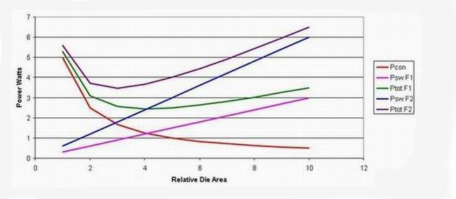 但是,在更高的工作頻率下,最佳裸片面積較小,從而帶來成本節約。實際上,在低頻率下,通過調整裸片面積來最小化損耗會帶來極高成本的設計。但是,轉到更高工作頻率后,我們就可以優化裸片面積來降低損耗,從而縮小電源的半導體體積。這樣做的缺點是,如果我們不改進半導體技術,那么電源效率將會降低.此主題相關圖片如下:圖2 :提高工作頻率會導致更高的總體損耗。