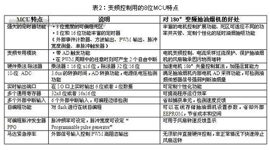 此外,這些MCU還具有帶2個(gè)自由中斷專用變頻控制模塊,以在PWM周期的任意時(shí)刻產(chǎn)生中斷,根據(jù)用戶需要的任意時(shí)刻對(duì)電流進(jìn)行采樣;專用于控制 PWM高阻態(tài)輸出的獨(dú)立外部信號(hào)輸入,可在非正常情況下快速停止風(fēng)扇的轉(zhuǎn)動(dòng);以及8位的可編程死區(qū)控制(死區(qū)時(shí)間范圍:0.1 s~25.6 s)等。圖2顯示了8位變頻控制MCU的主要特點(diǎn),表2則這些功能給出了詳細(xì)說明。