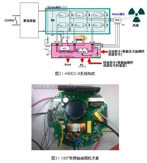 瑞薩電子開發(fā)了一套基于8位MCU ――uPD78F071x的低成本180°變頻抽油煙機(jī)方案HS/DC-8,該方案包括電源和電機(jī)控制部分(見圖2)。