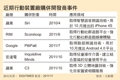 移動裝置市場競爭激烈,蘋果、Google、宏達電等大廠為凸顯產品獨特性,購并開發商成為重要布局。