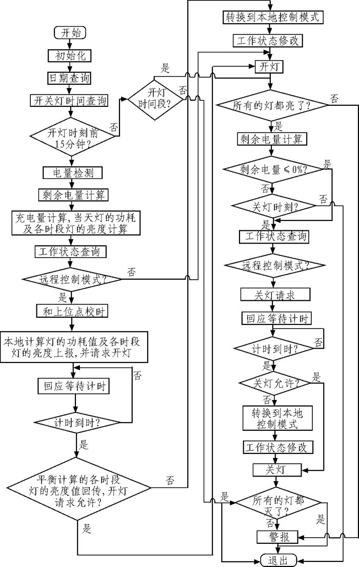 進(jìn)行太陽能路燈電池板電流檢測(cè),蓄電池電壓檢測(cè),蓄電池電量監(jiān)測(cè),以及環(huán)境溫度的檢測(cè),采用光開時(shí)關(guān),并實(shí)時(shí)上傳工作環(huán)境及狀態(tài)數(shù)據(jù),預(yù)警故障,保證系統(tǒng)的可靠性。圖2為太陽能路燈的開、關(guān)控制流程網(wǎng)。