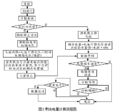 通過計(jì)算電流在時(shí)域上的積分,可得出電量變化值,在路燈工作前檢測(cè)到的電池電量作為初始電量,則剩余電量為初始電量減去電量變化值。同時(shí)通過對(duì)MPPT電路的輸出電流做積分,作為電量變化的校正值,從而得到較準(zhǔn)確的剩余電量值。圖5為剩余電量計(jì)算流程圖。