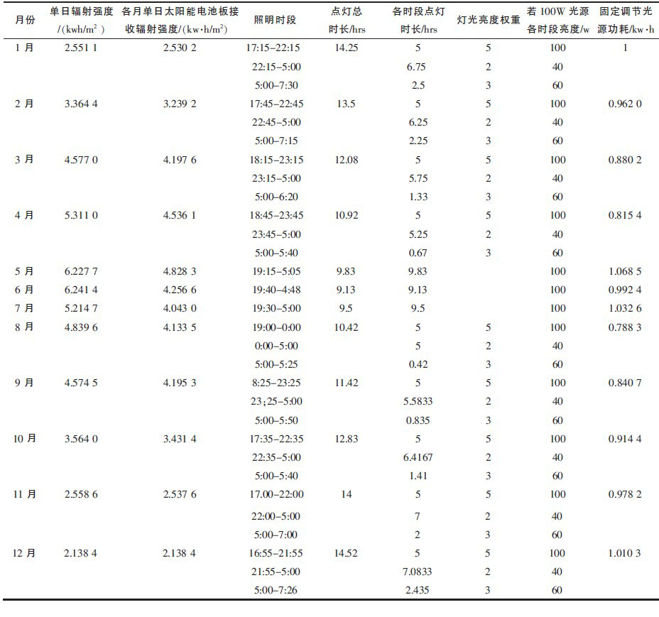 開關(guān)燈的時(shí)間根據(jù)天安門升降旗時(shí)間而定,如表1所示,全年最長(zhǎng)點(diǎn)燈時(shí)長(zhǎng)茌12月為14.52小時(shí),最短為9.13小時(shí)。照明時(shí)間分為3個(gè)時(shí)段,第一個(gè)時(shí)段從當(dāng)天天安門降旗時(shí)刻開始,為5個(gè)小時(shí),第二個(gè)時(shí)段到早上5點(diǎn),第三個(gè)時(shí)段從5點(diǎn)到滅安門升旗時(shí)刻,燈光亮度各時(shí)段權(quán)重比為5:2:3,如果以100 W光源為設(shè)計(jì)標(biāo)準(zhǔn),則光源功耗最大為1.068 5 kW-h。