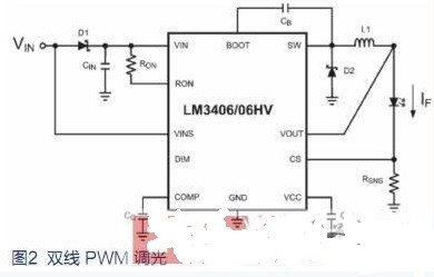 雙線PWM調光是用于汽車內部照明的常見方法。當VIN被調制為低于 VIN-NOMINAL的 70% 時,VINS引腳(圖2)檢測電壓的變化,并將PWM波形轉換為和輸出驅動電路相應的PWM。這種方法的缺點是轉換器的電源必須包含一個電路,以便為其直流輸出提供 PWM 波形。