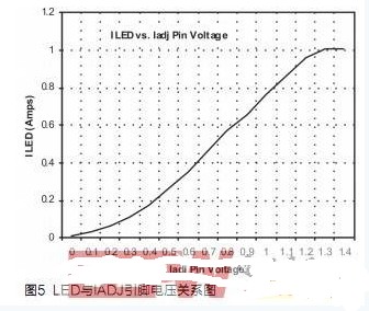 圖4顯示了測得的LED電流與IADJ引腳和Gnd之間的電位器電阻的關系圖。1Amp處的平頂表示最大額定LED電流,該值由圖4中所示的電流檢測電阻 RSNS設置。