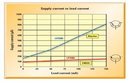 圖 1:不同的低壓降穩(wěn)壓器在滿載電流范圍內(nèi)的供電電流 (Iq) 比較,比較的兩款大致相同的 150mA 低壓降穩(wěn)壓器分別采用 CMOS 及雙極工藝技術(shù)制造