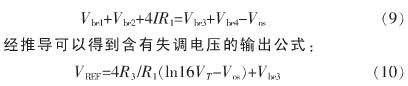 基準(zhǔn)源中運(yùn)放的設(shè)計是非常重要的,運(yùn)放的失調(diào)是基準(zhǔn)源的一個主要誤差源。由于不對稱性,運(yùn)放會受到輸入失調(diào)的影響。假設(shè)失調(diào)電壓為Vos,經(jīng)計算得到含失調(diào)電壓的輸出公式為: