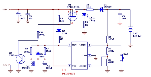 PT7M7433T是上海百利通公司最新設(shè)計(jì)的極高精度的一系列電壓檢測(cè)器的其中一款,其檢測(cè)精度在0-Vcc (5.5V)范圍內(nèi)小于1mV,而且其批量IC的檢測(cè)值偏差<±2.5%,這樣完全保證了批量產(chǎn)品的性能一致性和極高的總體性能,我們利用其配合少量外部電路即可組成相當(dāng)簡(jiǎn)單的鋰電池充電線(xiàn)路。