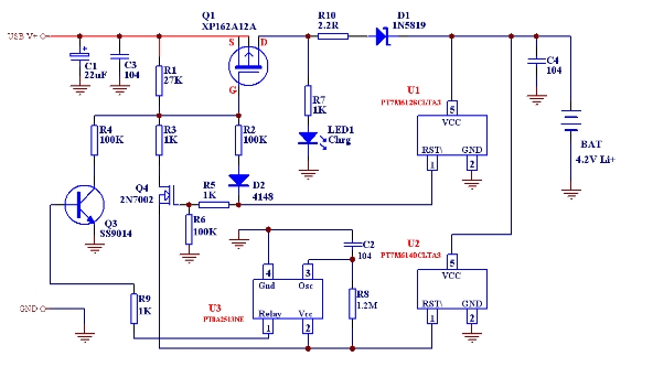 至此大家想必也大致了解了圖三的工作流程了:接上電池和充電器,如果電池電壓低于2.8V,則U1輸出為低(U2輸出也是低),這樣R3和R4的回路都不通,只有R2回路導(dǎo)通,給Q1提供微弱的導(dǎo)通,使之輸出約數(shù)毫安的電流給電池進(jìn)行預(yù)充電,當(dāng)電池電壓上升到超過(guò)2.94V(1.05X2.8)時(shí)或者剛接上電池電壓就超過(guò)2.94V時(shí),U1輸出高電平而U2繼續(xù)輸出低電平(電池電壓還沒(méi)達(dá)到4.2V J),這時(shí)R2通路截止而R3通路導(dǎo)通(因?yàn)镼4導(dǎo)通且其源極電平為低-因U1輸出拉低),從而由較小阻值的R3令Q1完全導(dǎo)通,提供一個(gè)數(shù)百毫安的大電流恒流充電,而當(dāng)這個(gè)恒流充電過(guò)程慢慢令到被充電的Li+電池端電壓上升到4.2V時(shí),U2也輸出高電平從而關(guān)閉Q4,但是它同時(shí)也給U3提供了電源導(dǎo)致U3開(kāi)始工作,這樣U3觸發(fā)Q3使R4導(dǎo)通提供一個(gè)很小的補(bǔ)充充電電流,直至U3達(dá)到定時(shí)時(shí)間從而關(guān)閉Q3,這時(shí)整個(gè)充電過(guò)程才完全結(jié)束。