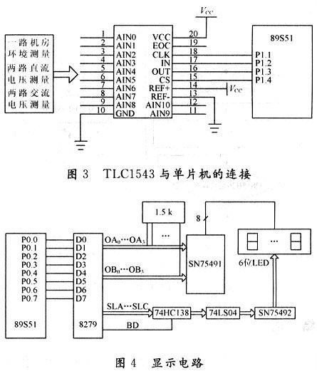 直流電壓、交流電壓以及機房溫濕度的測量選用TLC1543,TLC1543為10位11通道的A/D轉換器,與單片機的連接如圖3所示。機房環境測量(溫度、濕度)采用JWS溫濕度變送器,輸出信號為標準0~5V直流電壓信號;直流電壓的數據采集經電阻分壓后直接送至A/D轉換器,交流電壓的采集經分壓整流后也直接送至A/D轉換器。