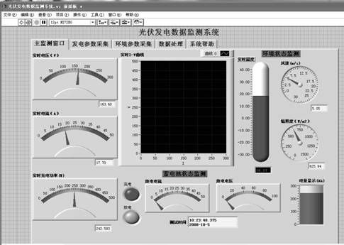 由于Labview使用G語言(圖形化語言)進行程序設計,因此該系統界面包含了光伏發電監測系統所要進行監測的溫度、電流、電壓以及輻照度等的全部信息,Labview中的VI程序由前面板、程序框圖、VI圖標3部分構成,其中前面板是VI 程序的用戶操作界面,是VI程序的交互式輸入和輸出端口。如圖4所示,系統前面板即系統界面主要由主監測界面以及各種參數界面組成。主界面主要由發電參數監測模塊、環境參數監測模塊和數據處理模塊3部分組成,各獨立參數模塊可以進行有關的參數設置,實時顯示數據,數據處理模塊可以存儲相關的歷史數據并進行數據回放,以便對特定模塊單獨進行分析處理。