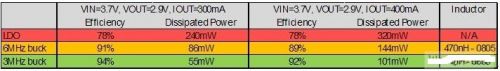 表1: LDO與 6MHz降壓轉(zhuǎn)換器和3MHz降壓轉(zhuǎn)換器的電源效率與功耗對比。