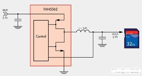 圖4:FAN5362降壓轉(zhuǎn)換器實現(xiàn)2.9V SD卡的供電電路。
