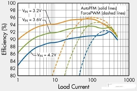 按照表1的計算,對于300mA的系統(tǒng),F(xiàn)AN5362能把功耗降至55mW;對于400mA的系統(tǒng),F(xiàn)AN5362能將功耗降至101mW。這些效率值根據(jù)所測得的FAN5362效率曲線而獲得。圖5顯示了AutoPFM(實線) 和 ForcePWM (虛線)的效率曲線。在優(yōu)化FAN5362效率的同時,選擇3MHz作為額定開關頻率,因為它能夠提供尺寸和效率之間的最佳權(quán)衡。從表1可看出,對于這種功耗敏感應用,采用6MHz開關頻率時的功耗遠遠大于采用3MHz開關頻率時的功耗。