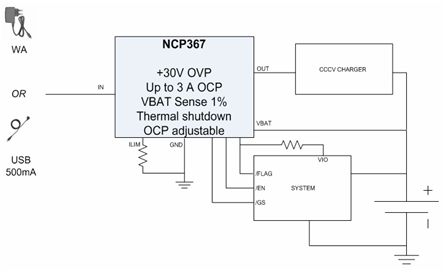 以NCP367為例,這是一款提供+30 V過(guò)壓保護(hù)及高達(dá)3 A過(guò)流保護(hù)、帶電池電壓檢測(cè)功能的保護(hù)IC(見(jiàn)圖5)。這器件保護(hù)便攜設(shè)備電池免受輸入過(guò)壓(在出現(xiàn)故障工作條件下會(huì)斷開(kāi)系統(tǒng)與Vbus或AC-DC適配器的連接)、充電過(guò)流及充電過(guò)壓影響。NCP367提供最大值100 mΩ的低導(dǎo)通阻抗,幫助降低方案成本及電路板占用空間。支持高達(dá)3 A電流的能力幫助實(shí)現(xiàn)快速充電。典型值50 μA的極低電流消耗兼容于USB 500 μA閑置模式。這器件能用于1.5 A或500 mA兩種充電電流等級(jí),非常適合手機(jī)等應(yīng)用。