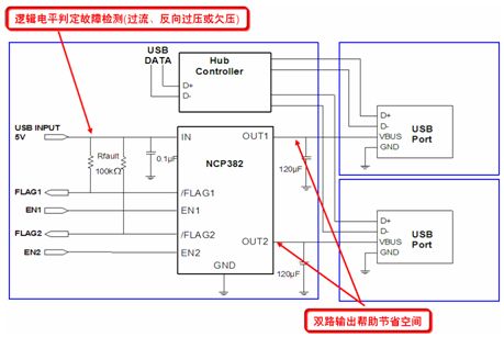 NCP382則是一款功率分配開(kāi)關(guān),其設(shè)計(jì)針對(duì)很可能會(huì)遇到大的電容性負(fù)載或短路的應(yīng)用。實(shí)際上,越來(lái)越多便攜電子設(shè)備采用USB供電,但需要保護(hù)本地USB電源夠用受外部Vbus故障影響。NCP382能夠通過(guò)在輸出負(fù)載超過(guò)限流閾值或出現(xiàn)短路時(shí)切換至恒流模式,將輸出電流限制在期望的電平(0.5 A、1 A或1.5 A),從而提供過(guò)流保護(hù)。NCP381接收2.5 V至5.5 V的單路輸入,提供2路輸出。圖6是NCP382的典型應(yīng)用電路圖。