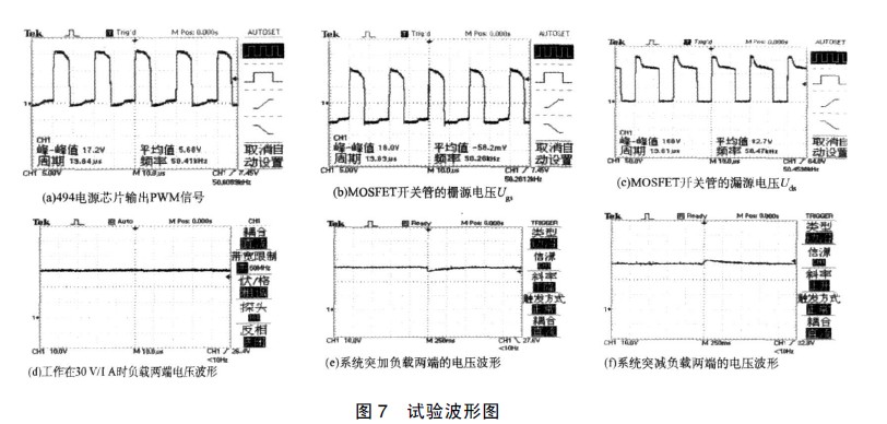 通過調壓器在供電電源端輸入110 V 的交流電壓, 使得系統穩定的工作在30 V、1 A 的負載下, 觀察TL494 電源芯片輸出的驅動信號波形、MOSFET 開關管Ugs、Uds 、負載正常工作時的波形、以及突然加載、突然掉載情況, 其試驗波形如圖7。