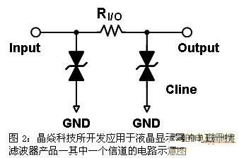 晶焱科技(Amazing Microelectronic Corp.)在靜電放電防護技術上已累積了豐富的經驗與技術。公司開發的應用于液晶顯示器的電磁干擾濾波器產品基本架構如圖2所示。由圖2電路示意圖可知:π型低通濾波器的Input與Output之間是采用電阻(RI/O)組件橋接,Input端點及Output端點對GND的電容則是采用雙向導通(bi-directional)的瞬時電壓抑制器(TVS)。因此,該系列產品除了可以提供良好的低通濾波效果之外,還擁有很好的靜電放電防護效果。