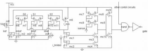 檢測電流引入到Mc8, 這可采用中的結構完成。然后鏡像到Mc5.當主功率管開始導通時, Mc5 和Mc6中的電流鏡像檢測電流緩緩上升,只要檢測電流小于此時所設定的極限電流, Mc3 和Mc4 就至少有一個工作在線性區, Mc3 和Mc4 作為一個整體呈電阻特性。因為若Mc3 和Mc4 已工作于飽和區, 則其電流一定會鏡像Mc1 和Mc2 中的電流即極限電流。這就會出現Mc3 和Mc4 中的電流與Mc5 和Mc6 中的電流不等的矛盾。因此, 只有當Mc3 和Mc4 中的電流與Mc5 和Mc6 中的電流相等時, Mc3 和Mc4 才工作于飽和區。