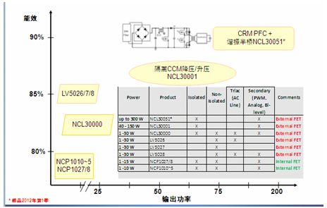 在安森美半導(dǎo)體用于LED照明的AC-DC電源方案中,1至10 W的照明應(yīng)用中推薦使用NCP1010~5,1至15 W可使用NCP1027/8,這些方案集成了MOS管,適用于隔離和非隔離應(yīng)用,支持次級PWM調(diào)光、模擬調(diào)光或雙亮度等級調(diào)光,能效高達(dá)75-80%;1至30 W的應(yīng)用可以使用LV5026、5027、5028,支持隔離方案,典型能效85%左右;1至40 W推薦使用NCL30000,可進行初級可控硅調(diào)光,適用于隔離和非隔離方案,隔離方案能效80-85%。40至150 W推薦使用NCL30001,它是一個連續(xù)導(dǎo)電模式(CCM)控制芯片,隔離方案的典型能效85-90%;更大功率推薦使用NCL30051。圖2是這些方案輸出功率與能效的對比。以下將具體介紹這些方案的功能和特點。