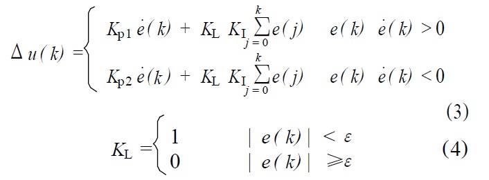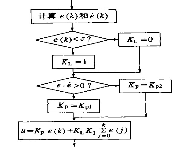 ③當│e(k)│≤ε時,即偏差值e(k)進入穩態區域時,加入積分環節,可保證系統的控制精度。