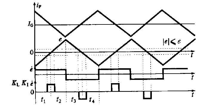 ④在區間1 和區間3 中,系統輸出在調節器的作用下向給定值I G 接近。為了減小系統穩態誤差,提高控制精度,采用大比例調節系數KP1使反饋電流i F 迅速接近I G.但KP1的增大會使系統的相對穩定性降低,甚至造成系統不穩定,所以在區間2和區間4 采用小比例調節系數KP2 ,以降低電流反饋值偏離給定值的速度。