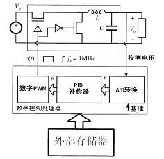 隨著數(shù)字芯片和電源技術(shù)的發(fā)展,現(xiàn)在出現(xiàn)了為電源控制而開發(fā)出來的控制處理器,它不同于數(shù)字芯片的中央處理器。控制處理器主要由高速AD轉(zhuǎn)換器,數(shù)字PID補償器和數(shù)字PWM輸出三部分組成。反饋環(huán)路的控制由它來完成,中央處理器作為管理模塊應(yīng)用在電源上。其原理圖如圖3所示: