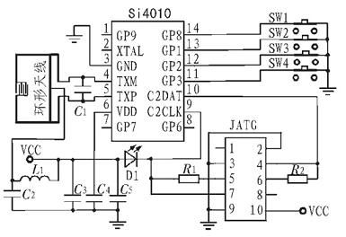 無線電發射系統是以Si4010 為核心來設計。Si4010 的4 個輸入輸出端口與按鍵直接相連,內部電路可直接采集按鍵狀態信息。Si4010 的信號差分輸出端TXM、TXP 分別與環形天線的兩端連接,環形天線直接印制在PCB 板上,減少了發射系統體積。采用C2 接口編程,Si4010 的C2DATA、C2CLK 端口與JTAG 接口的4 個端口相連。C3、C4、C5組成電源濾波電路。發光二極管提供按鍵動作指示,當有按鍵按下時,放光二極管亮,沒有按鍵按下,放光二極管滅。無線電發射系統的主要功能是在Si4010 內部MCU的控制下采集按鍵電路的狀態信息, 實現數據加密和編碼,再進行FSK 調制,調制后信號經放大調諧,由環形天線發射出去。