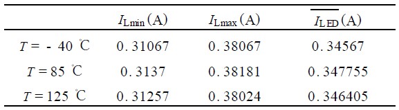 分別在V in = 2. 5V , V in = 28V 的情況下,再次對L ED 驅動電流進行仿真,三次仿真數據結果分別如表1 所示。