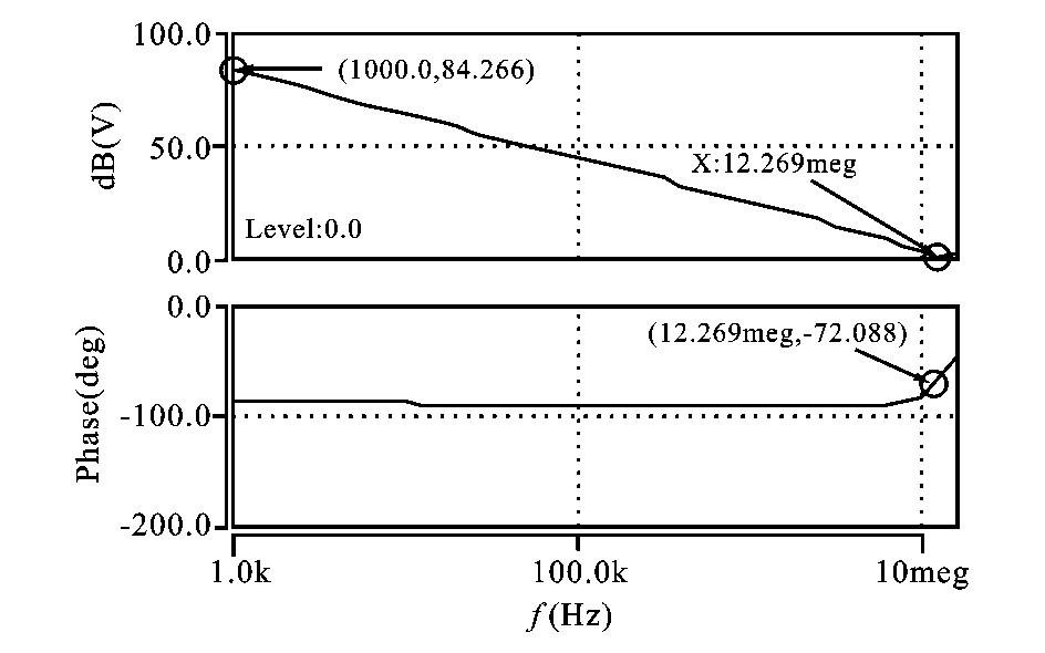 由運放的頻率特性仿真圖5 可知,增益達到84. 266dB ,相位裕度108°,單位增益帶寬約12MHz ,滿足電路要求。