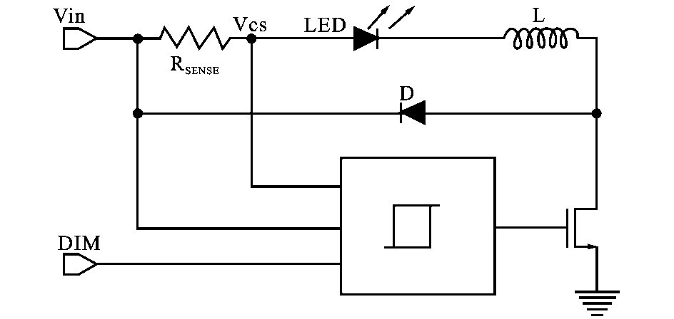 滯流控制模塊內部電路如圖2 所示,當DIM 信號為高電平期間,當Vcs 大于上電壓閾值時,控制電路輸出低電平,關閉功率開關管。 由LED、電感L 、續流二極管D 和RSENSE組成的回路使得電感繼續為L ED 提供電流,電感電流逐漸減小,使得檢測電壓Vcs 隨之減小;當Vcs 小于下閾值電壓時,控制電路輸出高電平,導通功率開關管,此時D 截止,形成從電源經RSENSE、L ED、L 和功率開關管到地的回路,電源為電感L 充電,電感電流上升,檢測電壓Vcs隨之升高。 Vcs 大于上電壓閾值時,控制電路關斷開關管,重復上個周期的動作,這樣就完成了對L ED驅動電流的滯環電流控制,使得流過L ED 的驅動電流,也就是電感電流的平均值恒定。