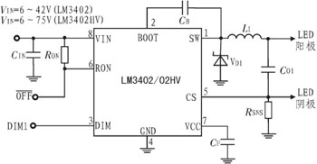 高亮度白光二極管一般采用恒流電源驅動。因為隨著LED逐漸變熱,其電壓降將減小,而且若LED串由恒壓電源供電的話,電源往往會持續提供過多的電流,使輸出電壓增大,直到電源達到電流限值或LED失效。脈寬調制方式是用較高的頻率開關LED,開關頻率超出人一般能夠察覺的范圍,給人一種LED總亮的假象,現在普遍采用脈寬調制方式調節LED的亮度,在某些應用中,調光比可達5 000:1,常用的LED驅動有降壓型(Buck)、升壓型(Boost)、升降壓型(Buck~Boost)等3種。LM3402是一款由可控電流源衍生的降壓型穩壓器,輸入電壓范圍涵蓋整個汽車應用領域,內置MOS管最多可以驅動5顆LED,性價比高,且接受領域較廣、線路簡潔實用,是眾多LED驅動IC中間的佼佼者。