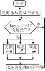 控制器程序根據3個按鈕的輸入狀態,實現開關或亮度調節,并將亮度狀態在4個指示燈上顯示出來。利用微處理器自身集成的EEPROM單元,可隨時保存亮度狀態n(PWM占空比)。主程序流程框圖如圖3所示。