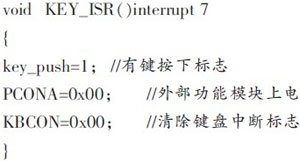 經檢測,在同等照度要求的情況下,采用LED調光控制系統的功耗較白熾燈降低90%以上,當然為進一步降低能耗,節能方法的探究仍然具有十分重要的意義。在多數時間,HBLEDs可能處于熄滅狀態,若控制系統處于待機狀態或掉電狀態,可將功耗降低到最低;或將OFF端口接地,也可將LM3402置于一個極低的低功率關機狀態。將微處理器P89LPC932的電源控制寄存器PCONA設置為0xFF時,外部功能模塊掉電;將電源控制寄存器PCON設置為03H時,可將微處理器處于完全掉電狀態,只有在中斷觸發的時候,才能喚醒,隨即給外部功能模塊上電,微處理器開始工作。微處理器主要通過鍵盤中斷喚醒,鍵盤中斷參考程序如下: