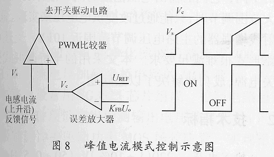 平均CMC由于要采樣濾波電感的電流,有時顯得不太方便,因此,實踐中經常采用一種變通的電流模式控制方法,即峰值CMC,如圖8所示。電壓外環輸出控制量(Vc)和由電感電流上升沿形成的斜坡波形(Vs)通過電壓比較器進行比較后,直接得到開關管的關斷信號(開通信號由時鐘自動給出),因此,電壓環的輸出控制量是電感電流的峰值給定量,由電感電流峰值控制占空比。
