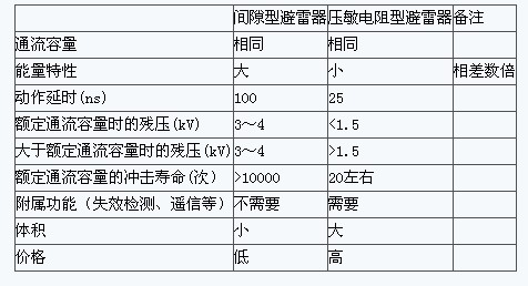 表1是不同類型的避雷器在同等測試波形(10/350μs)條件和相同的通流容量下的性能比較: