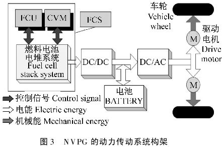另一種構架是并聯式的燃料電池混合動力系統的結構。這種構建通常在燃料電池和電機控制器之間安裝了一個DC/DC變換器,燃料電池的端電壓通過DC/DC變換器的升壓或降壓來與系統直流母線的電壓等級進行匹配。這種系統與上述構架不同之處還在于,這種動力系統的設計沒有考慮能量的回饋回收,因此系統雖然簡單,但效率比較低下。