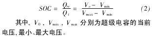 如果僅采用超級電容作為唯一輔助能源還存在諸多不足之處,如:電動汽車長時間停機后再次啟動,由于超級電容的自放電效應,在燃料電池的能量輸出尚未穩定時車載輔助系統的供電將無法保障。況且超級電容能量密度很低,若要達到一定的能量儲備能力其設備體積勢必加大。當前超級電容都是與其他動力電池一起購車輔助電源系統,在燃料電池汽車上使用的。為了克服精確的描述超級電容的特性,可以采用阻抗法進行建模代替簡單RC回路模型。超級電容當前SOC主要基于超級電容的輸出電壓: