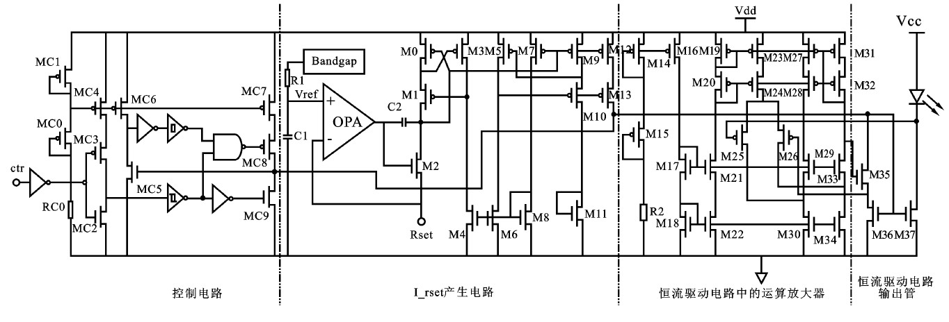 整個控制模塊利用施密特觸發(fā)器實現(xiàn)電平的準確翻轉(zhuǎn),通過邏輯門作用于MC8、MC9.這兩個MOS管在控制信號發(fā)生翻轉(zhuǎn)時迅速將電平拉高或拉低,實現(xiàn)了對控制信號控制功能的加速作用,電路的響應(yīng)速度快。當ctr信號為高時輸出禁止,ctr信號為低時輸出允許,從而實現(xiàn)利用外部的PWM信號實現(xiàn)調(diào)光功能。I_rset產(chǎn)生電路要實現(xiàn)通過外設(shè)電阻Rset對I_rest大小的控制,并且對與固定的Rset可以恒流輸出。利用帶隙電壓源產(chǎn)生一個基準電壓,利用運放實現(xiàn)基準電壓到基準電流的轉(zhuǎn)換。將運放的反相端連接到外設(shè)電阻Rset就實現(xiàn)了轉(zhuǎn)換的電流大小受控于Rset.通過后續(xù)電路將電流適當放大,最終給出I_rset.總體電路利用確立好的恒流驅(qū)動模塊實現(xiàn)恒流輸出。