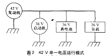 在新的電氣系統中,有兩種實施方案:一種是全車42V單一電壓方案;另一種是42V/14V雙電壓方案5。