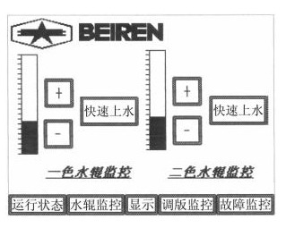 在人機(jī)界面中,設(shè)計了7幅畫面,包括整體圖形,故障顯示,機(jī)器速度和計數(shù)顯示,水輥速度顯示,調(diào)版監(jiān)控等。故障顯示使用指示器,給出位元件即可實現(xiàn)閃動效果,讓操作者很方便的知道故障部位,整體感很好。在水輥速度顯示中,設(shè)計了一個柱狀圖,可以顯示水量增加大小,只需按下柱狀圖,就可增加水量,同時也可方便監(jiān)控。如圖所示: