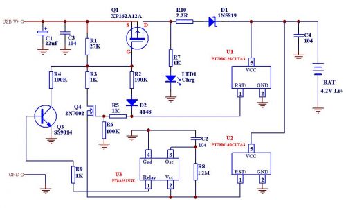 乍看之下,這個方案采用了三個IC,可是U1和U2是采用的SOT-23或者TO-92封裝,就好像普通三極管一樣,其價格也就是2-3個三極管的價格,而U3(PT8A2513NE)也是采用的TO-94封裝,外形和三極管很相似,價錢也相當便宜,不過,這個電路可以實現智能判斷電池是否過放電,決定是否在開始充電時采用小電流預充,另外,采用U3后也將充電后期的補充充電過程延長到大約一個小時!