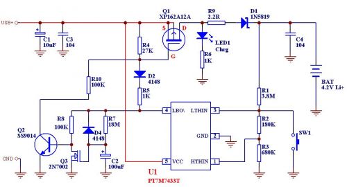 其工作流程大致是:當接上Li+電池和供電電源時,IC通過R1/R2/R3組成的網絡檢測電池電壓,如果電池電壓低于3.3V(由R1-R3的電阻值決定),或者按下按制SW1,此時IC3腳的電壓低于615mV,則IC4腳輸出低電平,通過R5/D2拉低Q1的柵極使之導通,從而通過Q1/R9/D1給電池進行大電流充電,當電池電壓一路上升直至超過4.20V,此時IC的1腳電壓高過615mV,IC內部經簡單判斷和延時,令4腳輸出高電平,從而關閉大電流充電通道,但是4腳的高電平同時給R7/C2的充電回路供電,令到Q3的柵極電壓慢慢升高,并給R8提供通路導致Q2導通,通過R10給Q1提供一個較弱的導通電流,使之微微導通,從而為電池提供一個較少的補充充電電流。按照圖中所示元件參數將于大約十分鐘后,由于C2的不斷充電,其端電壓即Q3的柵極電壓不斷上升直至使Q3導通,從而關閉Q2,令到整個充電過程結束。