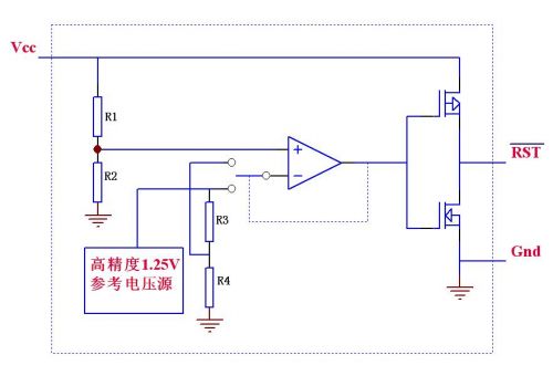 IC內含一個高精度的615mV基準電壓源、兩個比較器、一個RS觸發器和其它一些邏輯電路,其大致功能是:VCC電壓或其它待檢測電壓通過R1-R3組成的分壓網絡接在IC的LTHIN /HTHIN檢測引腳,當待測電壓下降導致LTHIN引腳低于615mV時,輸出腳LBO輸出低電平,而如果待測電壓上升導致HTHIN引腳高于615 mV時,經過內部邏輯判斷和簡單延時后,輸出腳LBO輸出高電平。