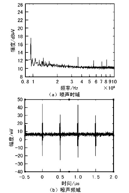 為了測(cè)試這種設(shè)計(jì),用線性電源(0~32V,5A)來給數(shù)字PCB供電。這樣選擇的線性電源不會(huì)引入高頻噪聲影響測(cè)試結(jié)果。直流輸入噪聲的時(shí)域和頻域圖如圖1所示。圖1中可以看出,頻率1MHz的噪聲最大,因此EMI濾波器要抑制頻率為1MHz的噪聲。