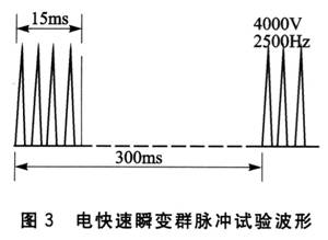 由于閃電、接地故障或切換電感性設(shè)備而引起的信號(hào)參數(shù)產(chǎn)生瞬時(shí)擾動(dòng),產(chǎn)生的高頻干擾信號(hào)主要是通過系統(tǒng)進(jìn)線電源進(jìn)入系統(tǒng)內(nèi)部。檢測這方面的抗干擾能力,主要是通過“電快速瞬變脈沖群抗擾度試驗(yàn)”驗(yàn)證。根據(jù)低壓電器產(chǎn)品試驗(yàn)標(biāo)準(zhǔn)要求,試驗(yàn)時(shí)在供電輸入端疊加頻率為2 500 Hz,幅度4 000 V的群脈沖,分別進(jìn)行相線、地線的差模、共模,正極性、負(fù)極性試驗(yàn),每項(xiàng)試驗(yàn)時(shí)間均為1 min,群脈沖的波形如圖3所示。如果在“電快速瞬變脈沖群抗擾度試驗(yàn)”過程中保護(hù)器不產(chǎn)生誤動(dòng)作,則這方面的抗干擾能力就是合格的。