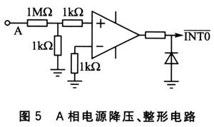 數(shù)字采樣方法具有數(shù)字濾波效果,對(duì)信號(hào)的通道干擾有抑制作用。設(shè)定每個(gè)周期采樣100個(gè)點(diǎn),由定時(shí)器T0產(chǎn)生采樣時(shí)間間隔。將系統(tǒng)某相進(jìn)線電源(如A相) 信號(hào)經(jīng)過降壓、整形電路如圖5所示,轉(zhuǎn)換為方波信號(hào)。作為單片機(jī)中斷0的觸發(fā)信號(hào),在正常情況下電源信號(hào)的頻率為50Hz左右,在兩次中斷期間,對(duì)剩余電流的采樣次數(shù)為100次。