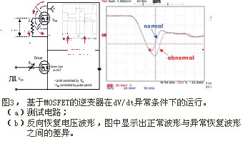 通常,增加?xùn)艠O阻抗會(huì)降低MOSFET的開關(guān)速度。在如圖3(a)所示的半橋電路中,如果高壓側(cè)MOSFET的柵極阻抗 (在HVIC中實(shí)現(xiàn)) 大,將會(huì)存在一定的短路電流;這個(gè)電流是上面那個(gè)MOSFET導(dǎo)通時(shí)的密勒電容Cgd感應(yīng)產(chǎn)生的,不嚴(yán)重時(shí)一般不會(huì)察覺。但是,正如圖3(b)所示,這種異常行為會(huì)增加逆變開關(guān)的損耗 (導(dǎo)通損耗),并最終減弱系統(tǒng)的額定功率和穩(wěn)定性。在這樣的瞬態(tài)過程中,要降低開關(guān)速度,同時(shí)又不失穩(wěn)定性,上方那個(gè)MOSFET的Vgs應(yīng)小于閾值電壓Vth。換句話說(shuō),最好通過調(diào)節(jié)HVIC的關(guān)斷阻抗來(lái)保證系統(tǒng)的穩(wěn)定性,防止因電壓變化而感應(yīng)短路電流。但這會(huì)增加MOSFET的關(guān)斷dV/dt值。